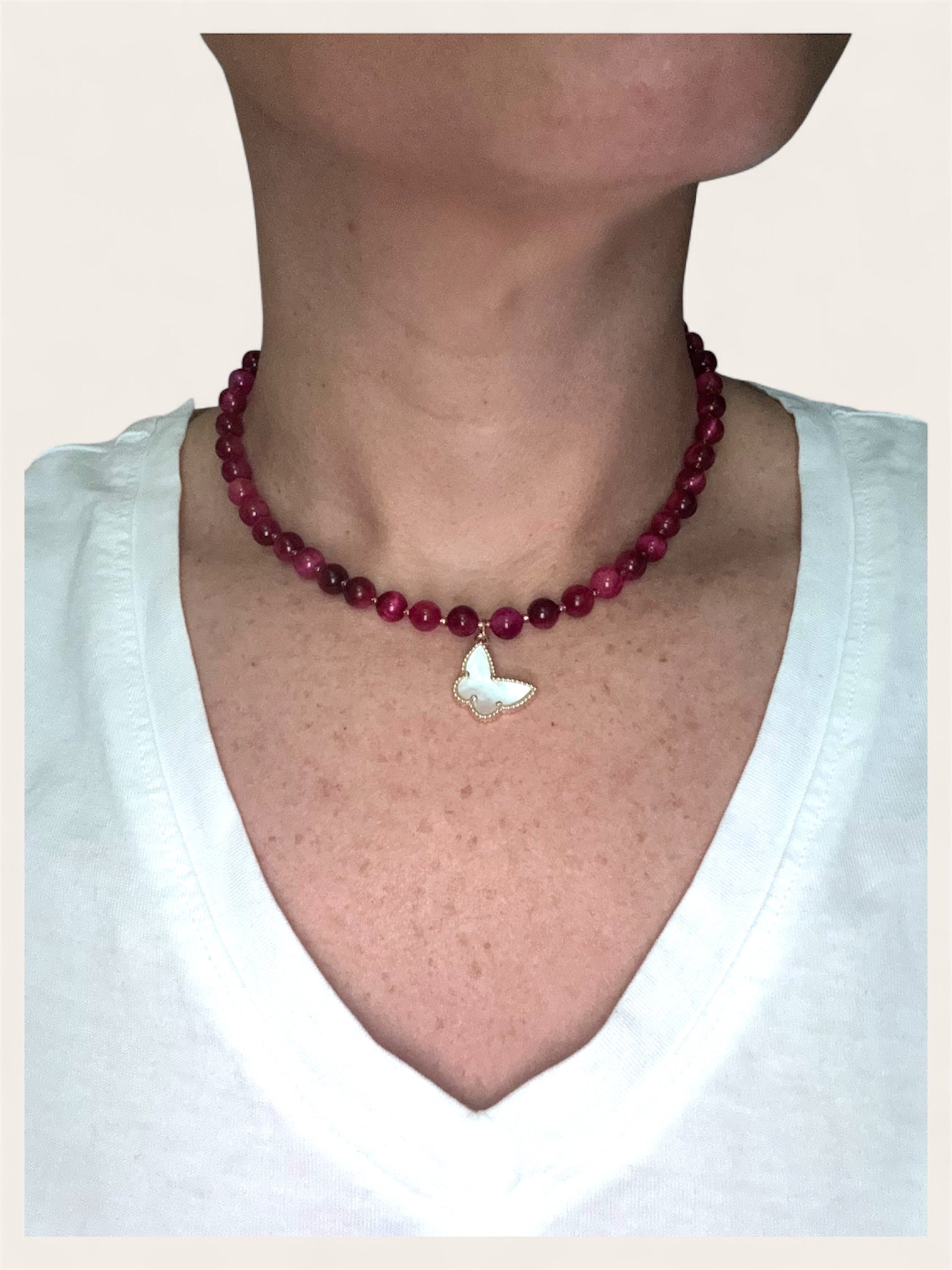 Embrace the transformative energy of our Red Tiger Eye Butterfly Necklace! This stunning piece features a captivating butterfly pendant crafted from iridescent mother of pearl, symbolizing change and freedom. The vibrant red tiger eye stones not only add a striking pop of color but also enhance confidence and strength. Wear it and feel empowered!