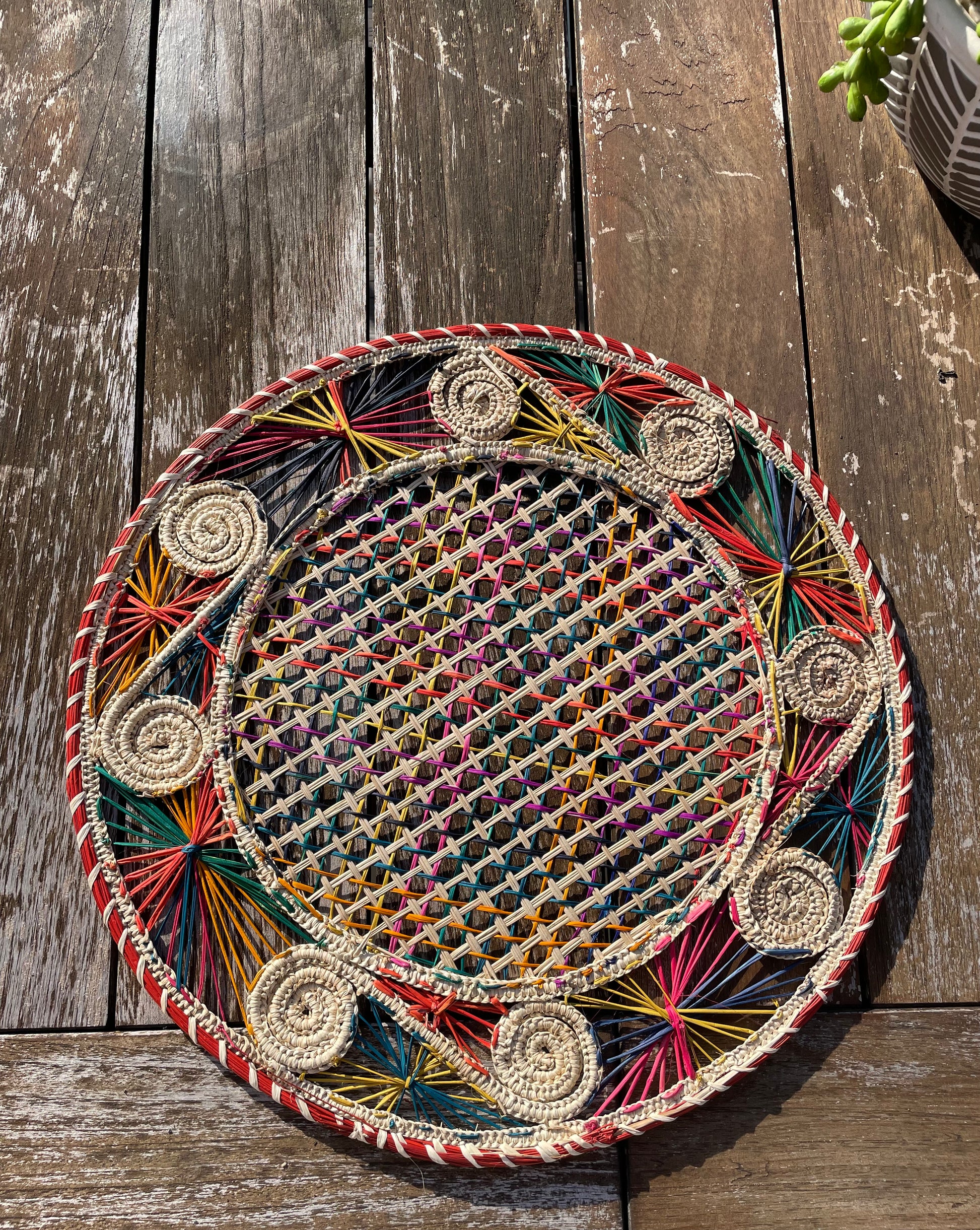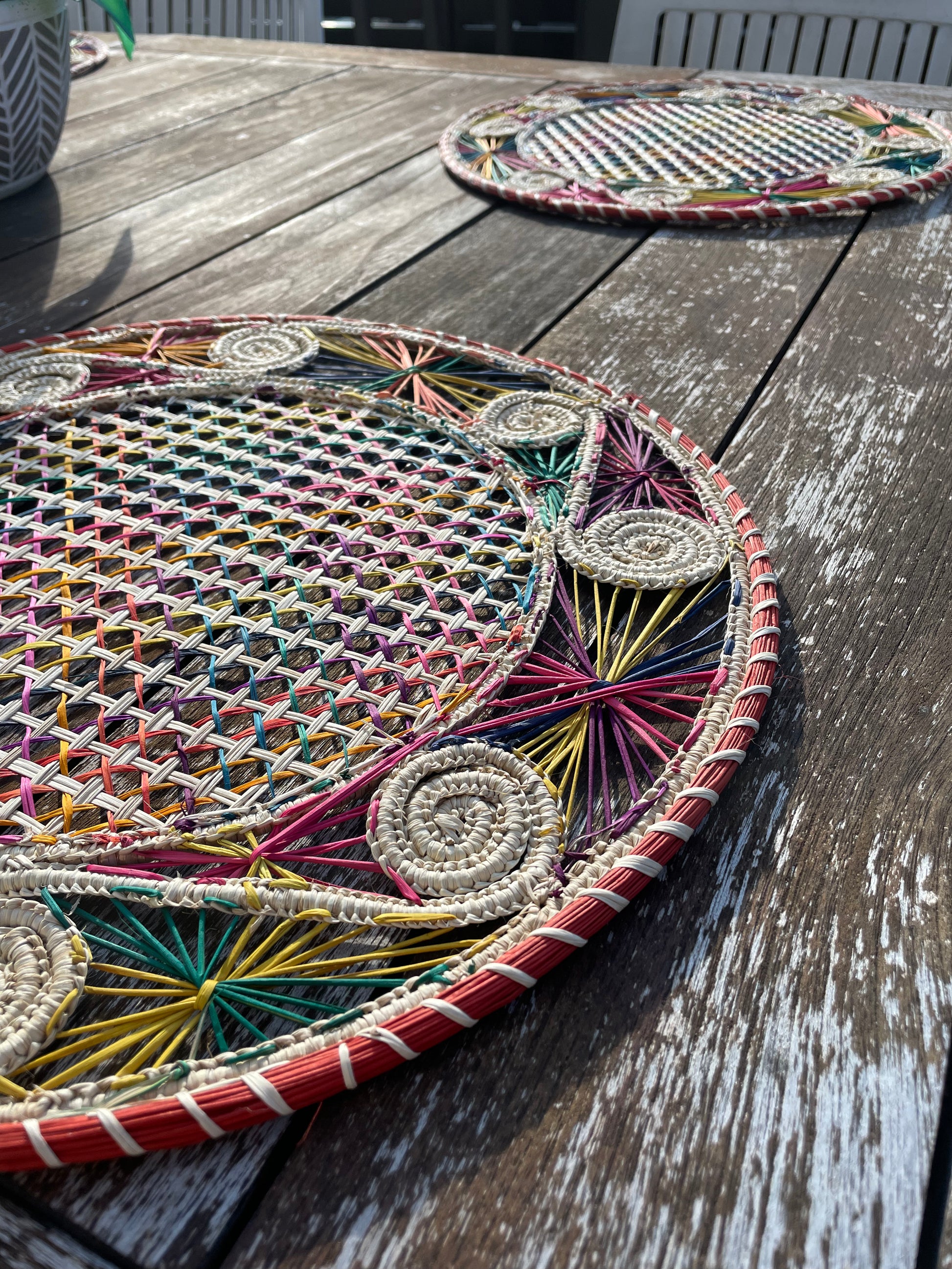 Ces sets de table ronds méticuleusement fabriqués à la main apportent un charme distinct à n'importe quelle table, fabriqués avec des fibres biologiques pures par des artisans colombiens. Le design coloré permet une coordination sans effort avec n'importe quelle teinte de serviette.