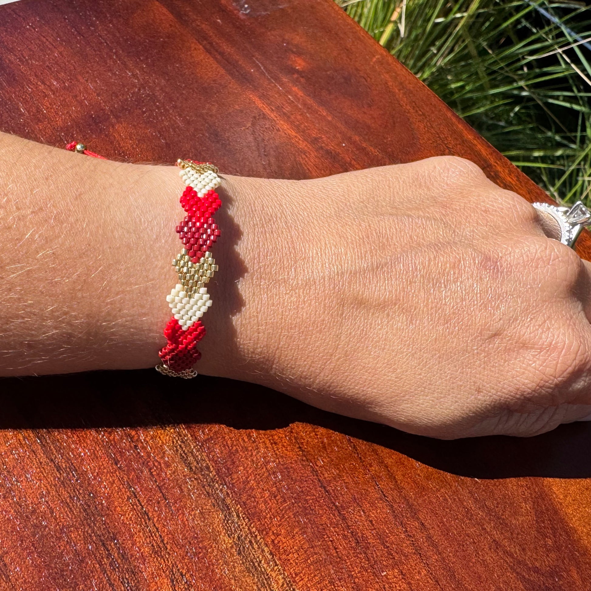 Add a touch of artisanal elegance to your look with this delicate handwoven Miyuki bracelet. Featuring a pattern of interlinked hearts in shades of red, cream, and gold, this piece is carefully crafted using high-quality Miyuki beads for a smooth and refined finish. Lightweight yet durable, it offers a comfortable fit and a timeless design that symbolizes love and connection. Perfect for everyday wear or as a thoughtful gift, this bracelet is a versatile accessory that carries both style and meaning.